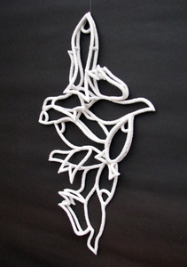 2013Fietsend langs de sloot in de Houtrakpolder bij Spaarndam, waar ik dertig jaar gewoond heb, genoot ik altijd van het spel van wolken met de blauwe lucht die weerspiegelden in het water. Ik moest dan denken aan het gedicht van Lucebert getiteld: ‘Visser van Ma Yuan’. Een kleine zijsprong voert me naar de bekende prent ‘Lucht en water’ van M.C. Escher, waarop vogels en vissen in elkaar overgaan. Dit wandrelief is mijn versie van vogels die varen en vissen die vliegen.