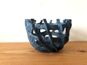 2015Handgevormd in mal van steengoedklei met chamotte en zilverzand. Decoratie met slibs aan de buitenkant van een bladdecor in wit, blauw en zwart. Aan de binnenkant decor in blauwe tinten in spiraalvorm, met een druppelvorm van glazuur in de bodem. Gestookt in gasoven op 1140 graden Celsius. Zie ook onder Objecten: Bamboevorm met dezelfde decoratie.