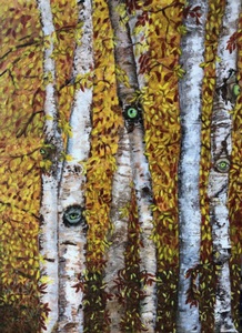 2024Mijn uitgangspunt is mijn deelname aan GaLandart 2019 (kunst in en met de natuur) in Hamont Achel (BE). Ik maakte daarvoor een installatie van keramische ogen die ik in berkenbomen hing. Bomen zijn sociale wezens. Via hun wortels voeden ze hun kinderen en hun behoeftige buren. In de Scandinavische landenvereert men berkensoorten als bomen van het licht. De ogen van een berk zijn die van een rijpe vrouw die ooit vanuit de wwortels verscheen. Als een mens van haar melk dronk, vertienvoudigde zijn kracht.